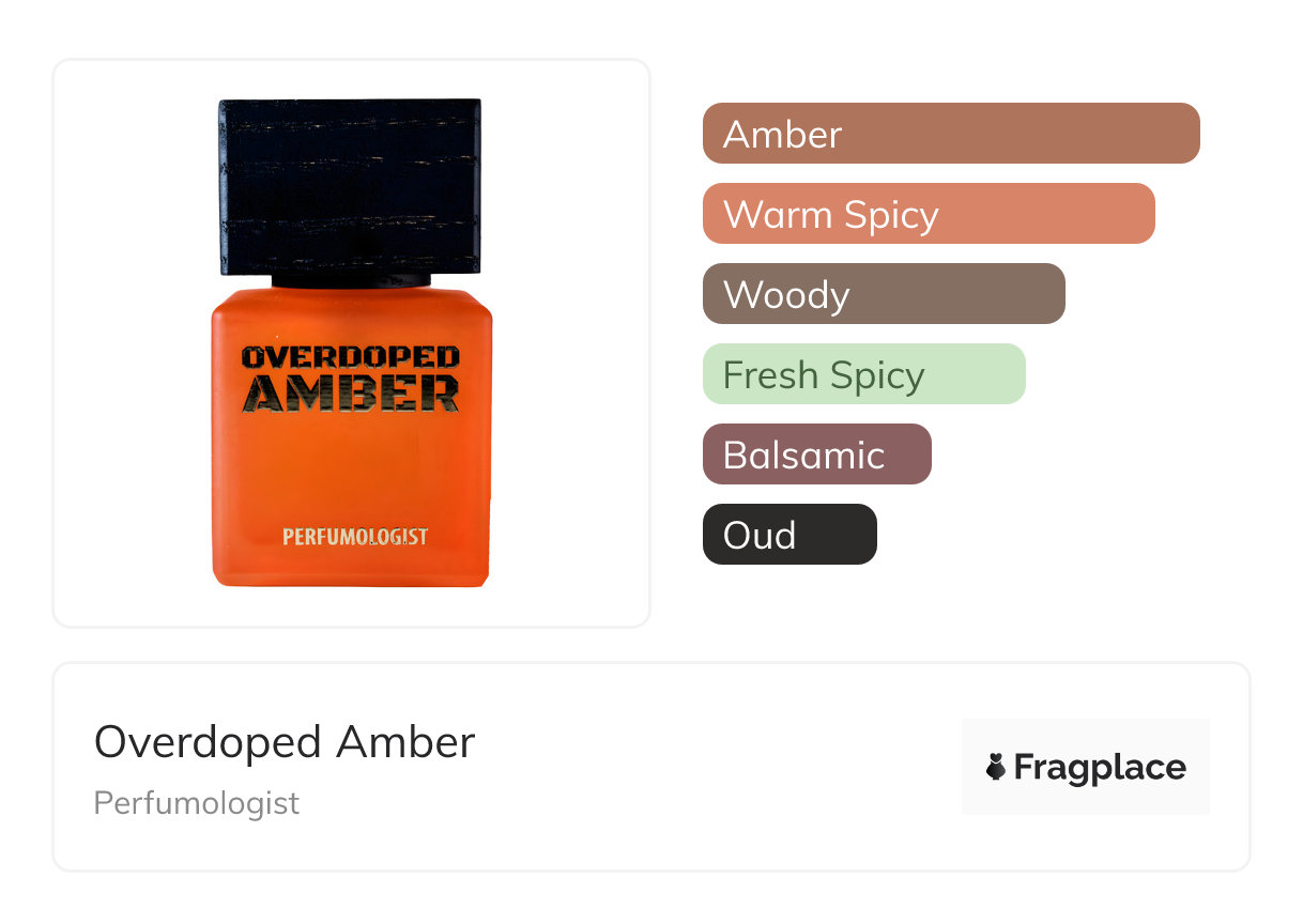 Overdoped Amber, from Perfumologist was released in 2019. The perfumer behind this creation is unknown. It has the top notes of Bergamot and Pepper, middle notes of Amber, Incense, and Labdanum, and base notes of Agarwood (Oud), Patchouli, and Sandalwood.