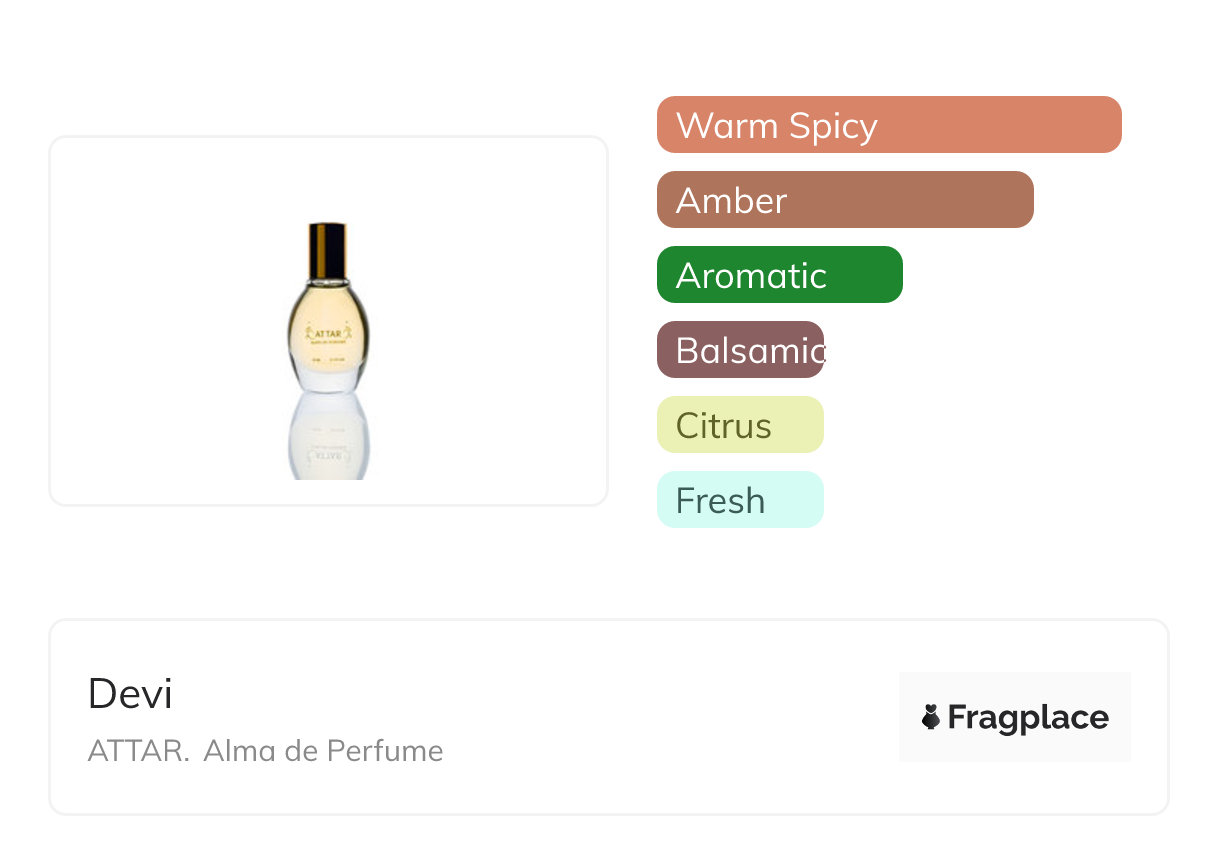 Devi, from ATTAR. Alma de Perfume was released in 2020. The perfumer behind this creation is Rosario Escobar. It has the top notes of Cardamom, Ginger, and Neroli, middle notes of Copal, Praline, and Rose, and base notes of Amber, Incense, and Juniper Berries.