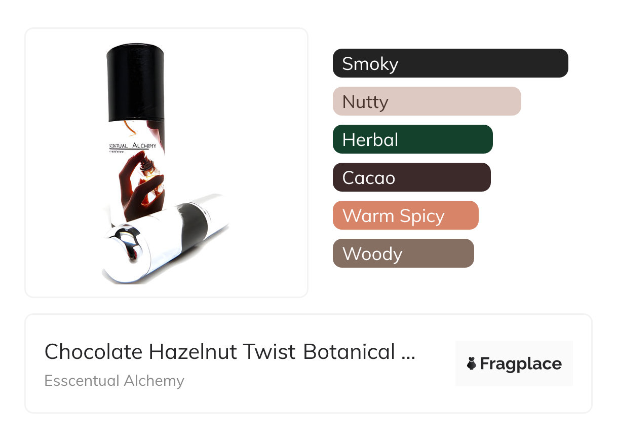 Chocolate Hazelnut Twist Botanical Perfume, from Esscentual Alchemy was released in 2010. The perfumer behind this creation is Amanda Feeley. The notes are Cacao Pod, Hazelnut, Rooibos Red Tea.