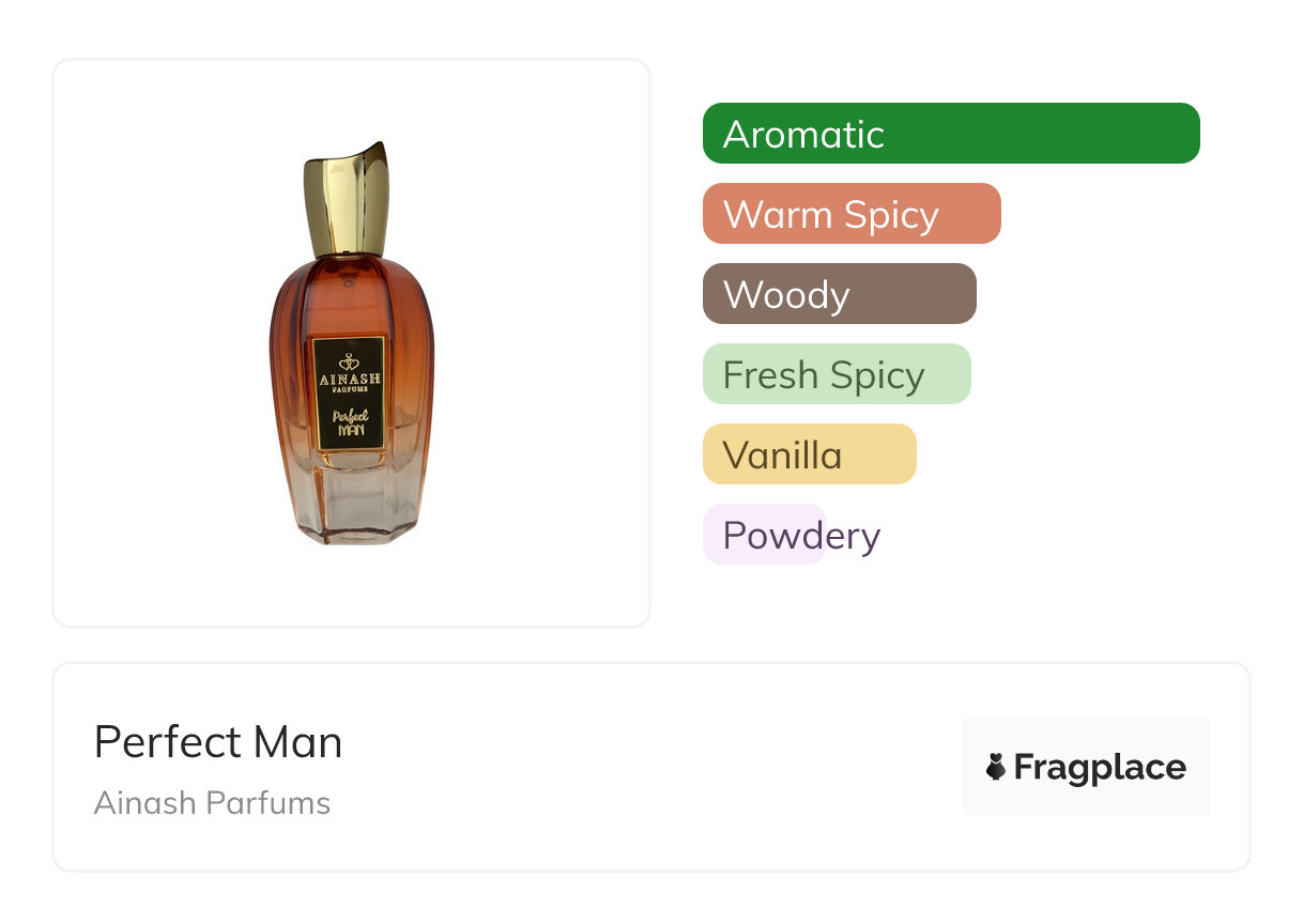 Perfect Man, from Ainash Parfums was released in 2022. The perfumer behind this creation is unknown. It has the top notes of Cinnamon, Coriander, Juniper, and Sandalwood, middle notes of Ginger, Lavender, Petitgrain, and Rosemary, and base notes of Tonka Bean and Vanilla.