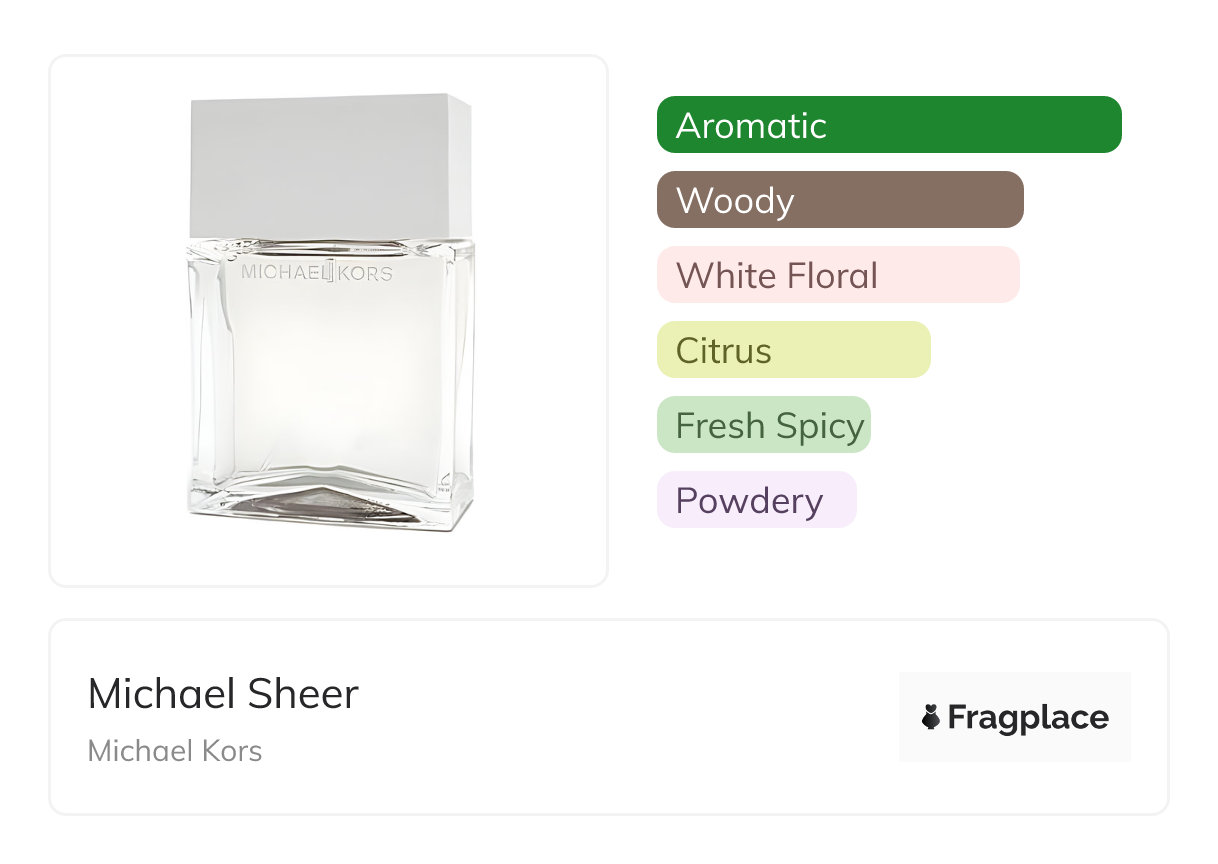 Michael Sheer, from Michael Kors was released in 2003. The perfumer behind this creation is unknown. It has the top notes of Bergamot, Lemon, Mandarin Orange, and Sea Water, middle notes of Cloves, Currant Leaf and Bud, English Marigold, Geranium, Honeysuckle, Jasmine, Lily-of-the-Valley, Rose, Tuberose, and Ylang-Ylang, and base notes of Amber, Cedarwood, Heliotrope, Musk, Sandalwood, and Vetiver.