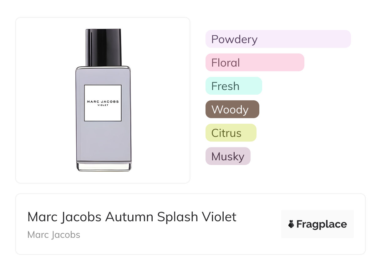 Marc Jacobs Autumn Splash Violet, from Marc Jacobs was released in 2006. The perfumer behind this creation is unknown. It has the top notes of Bergamot and Peony, middle notes of Orchid, Orris Root, and Violet, and base notes of Cedarwood, Ginger, Musk, and Vanilla.