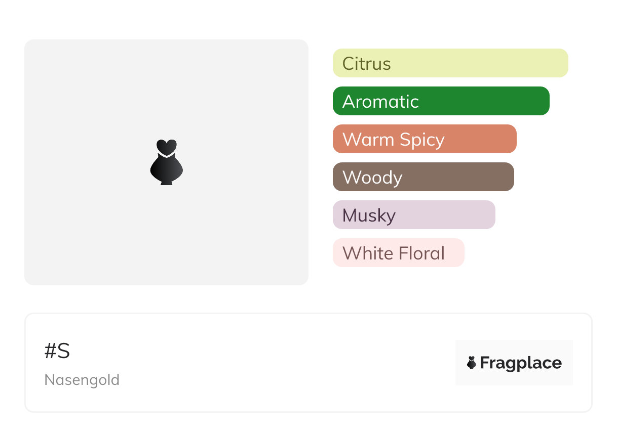 #S, from Nasengold was released in 2013. The perfumer behind this creation is Christian Plesch. It has the top notes of Artemisia, Bergamot, Cardamom, Citron, Ginger, Grapefruit, Pink Pepper, and Red Wine, middle notes of Lily-of-the-Valley, Malt, Red Wine, Rose, and Tuberose, and base notes of Incense, Iso E Super, Leather, Musk, Oakmoss, and Vetiver.
