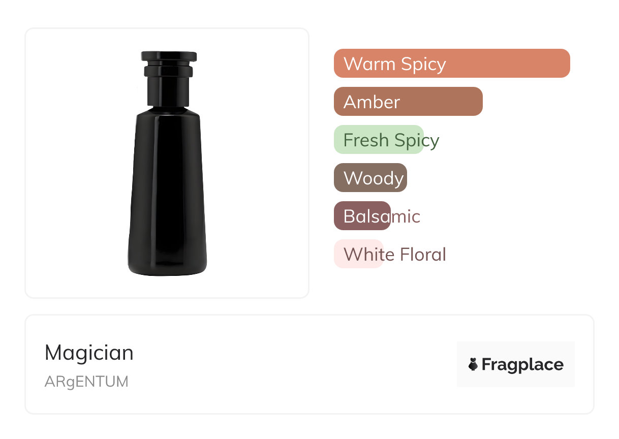 Magician, from ARgENTUM was released in 2022. The perfumer behind this creation is Delphine Thierry. It has the top notes of Orange Blossom and Pepper, middle notes of Cloves, Pepper, and Pimento, and base notes of Benzoin, Cedarwood, Labdanum, and Myrrh.