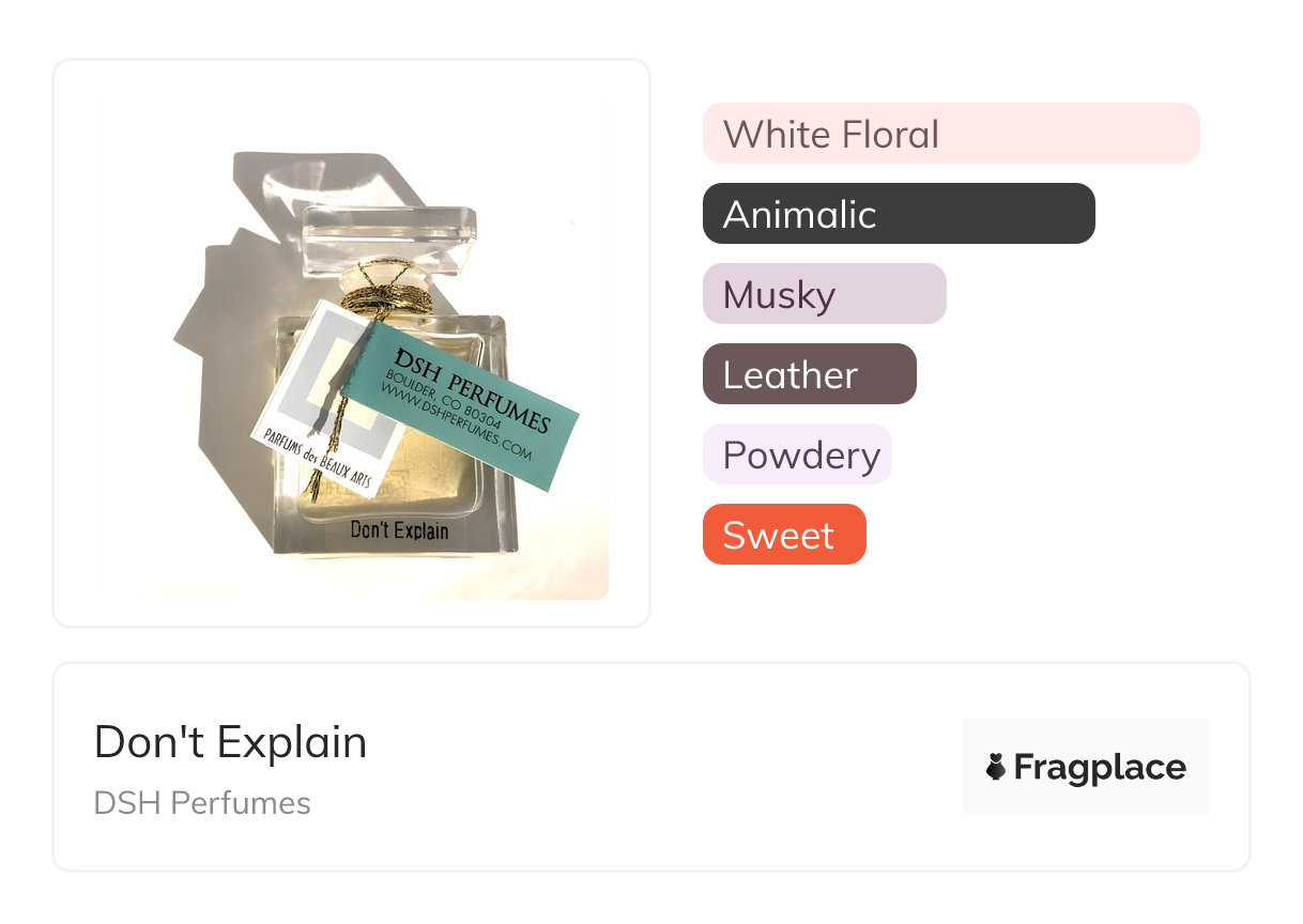 Don't Explain, from DSH Perfumes was released in 2021. The perfumer behind this creation is Dawn Spencer Hurwitz. The notes are Ambergris, Butter, Castoreum, Cheese, Civet, Gardenia, Green Notes, Jasmine, Leather, Mushroom, Musk, Orange Blossom, Sandalwood, Tiare Flower, Tobacco, Tuberose.