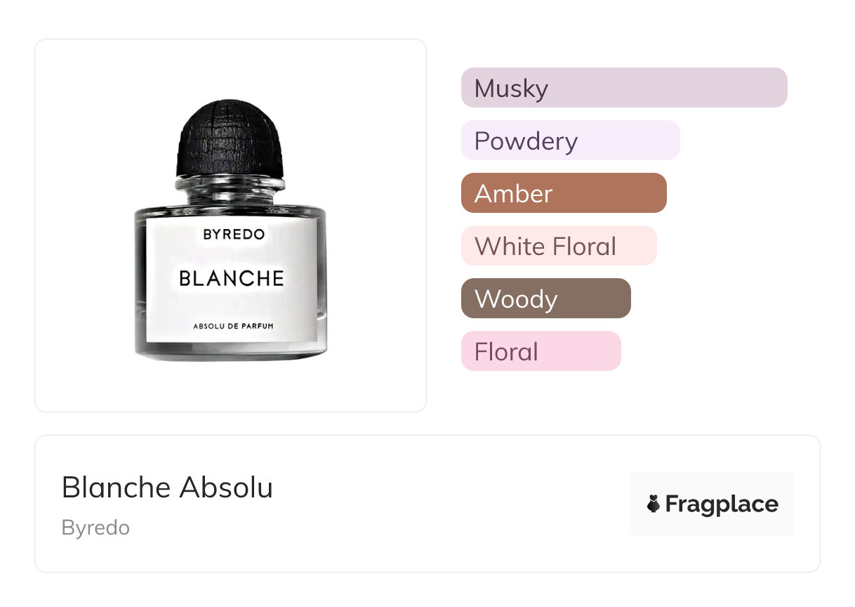 Blanche Absolu, from Byredo was released in 2025. The perfumer behind this creation is unknown. It has the top notes of Aldehydes, Neroli, and Pepper, middle notes of Jasmine, Rose, and Violet, and base notes of Ambroxan, Cashmeran, Cashmere wood, and Musk.