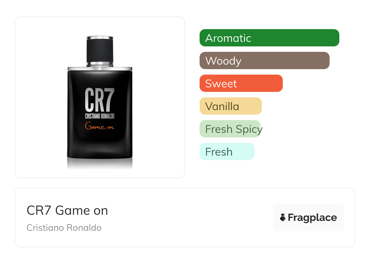CR7 Game on, from Cristiano Ronaldo was released in 2020. The perfumer behind this creation is unknown. It has the top notes of Apple, Cardamom, Ice, and Papaya, middle notes of Elemi, Lavender, and Violet, and base notes of Cashmere wood, Cedarwood, Guaiac Wood, Juniper Berries, Sugar, and Tonka Bean.