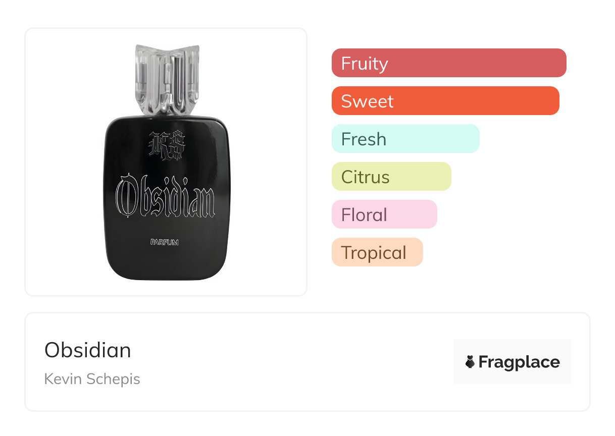 Obsidian, from Kevin Schepis was released in 2023. The perfumer behind this creation is unknown. It has the top notes of Grapefruit, Passionfruit, Pineapple, Strawberry, and Tangerine, middle notes of Jasmine, Orchid, Peony, and Red Berries, and base notes of Musk and Woody Notes.