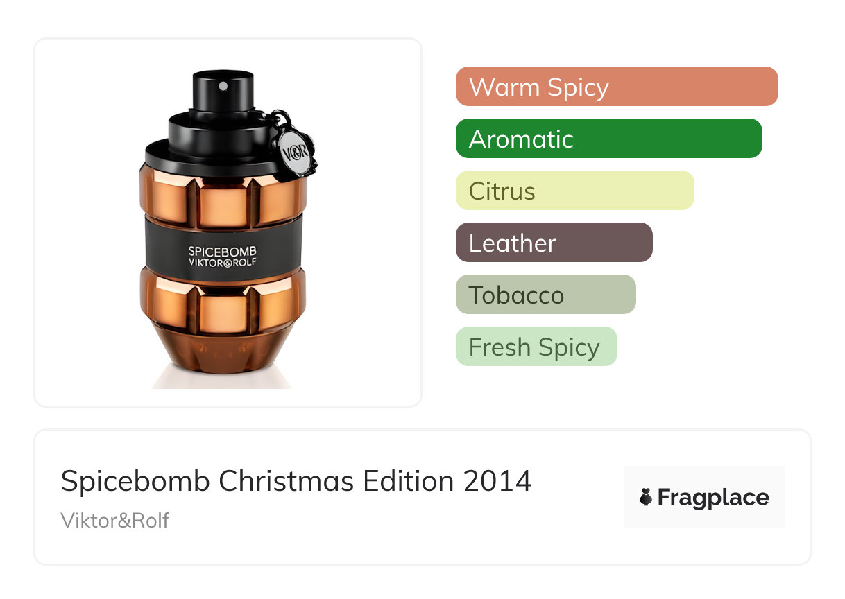 Spicebomb Christmas Edition 2014, de Viktor&Rolf fue lanzado en 2014. El perfumista detrás de esta creación es desconocido. Tiene las notas de salida de Bergamota, Elemi, Pomelo, and Pimienta rosa, notas de corazón de Canela, Pimiento, and Azafrán, and notas de fondo de Piel, Tabaco, and Vetiver.