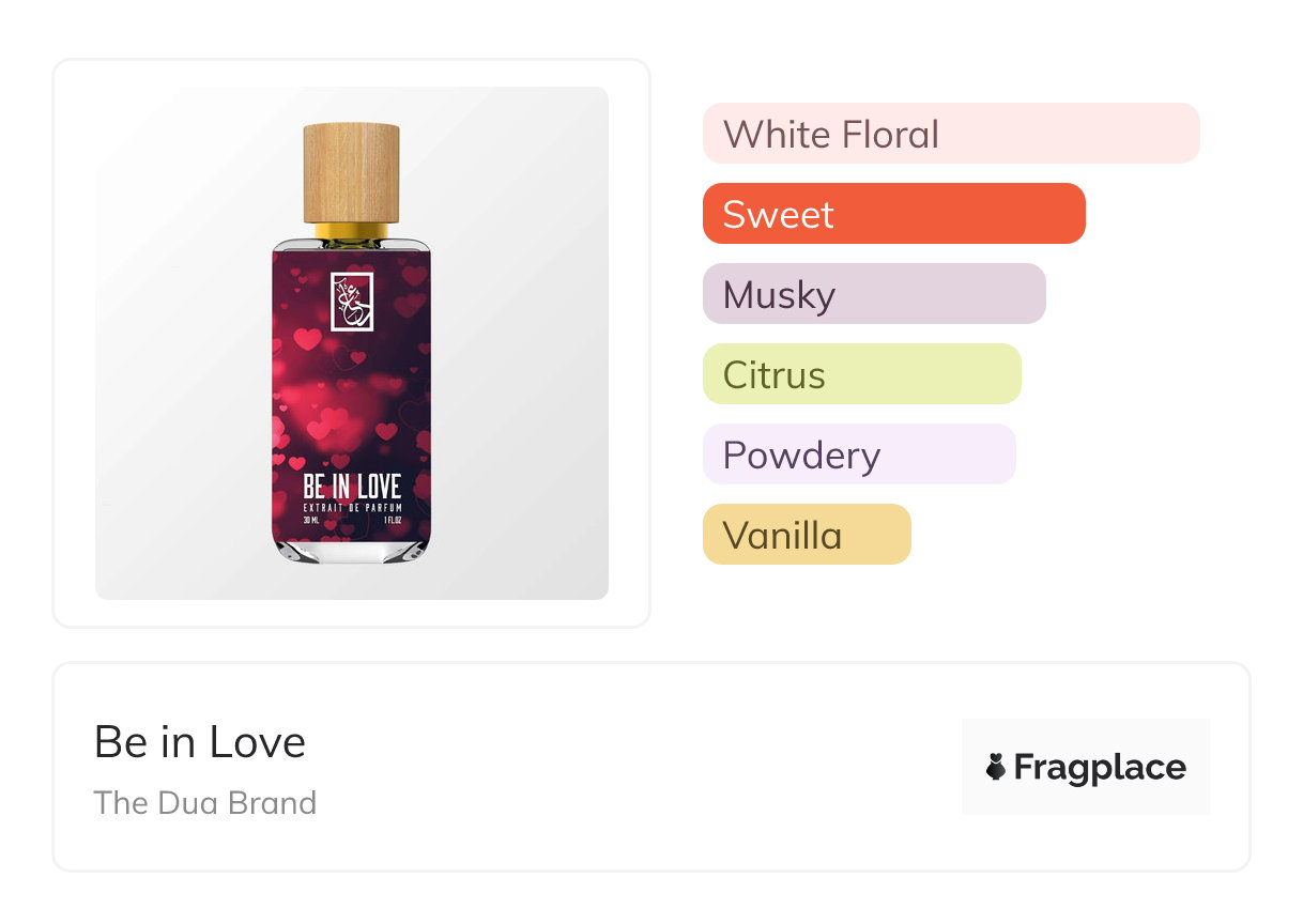 Be in Love, de The Dua Brand fue lanzado en 2021. El perfumista detrás de esta creación es desconocido. Las notas son Bergamota, Caramelo, Civet, Cilantro, Madreselva, Iris, Jazmín, Labdanum, Almizcle, Neroli, Azahar, Pimienta rosa, Rosa, Azúcar, Vainilla.
