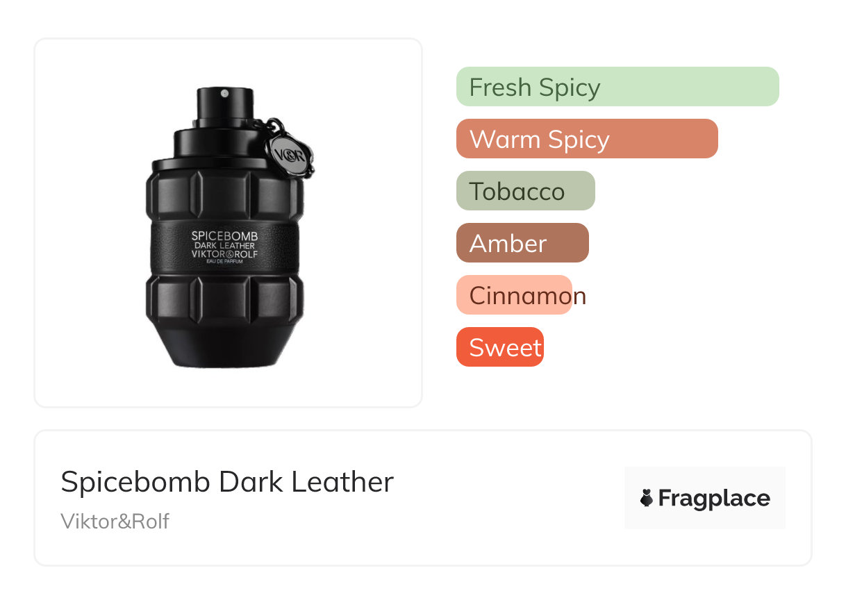 Spicebomb Dark Leather, de Viktor&Rolf fue lanzado en 2024. El perfumista detrás de esta creación es desconocido. Tiene las notas de salida de Nuez moscada and Pimienta, notas de corazón de Canela and Olíbano (incienso), and notas de fondo de Cuero negro and Tabaco.