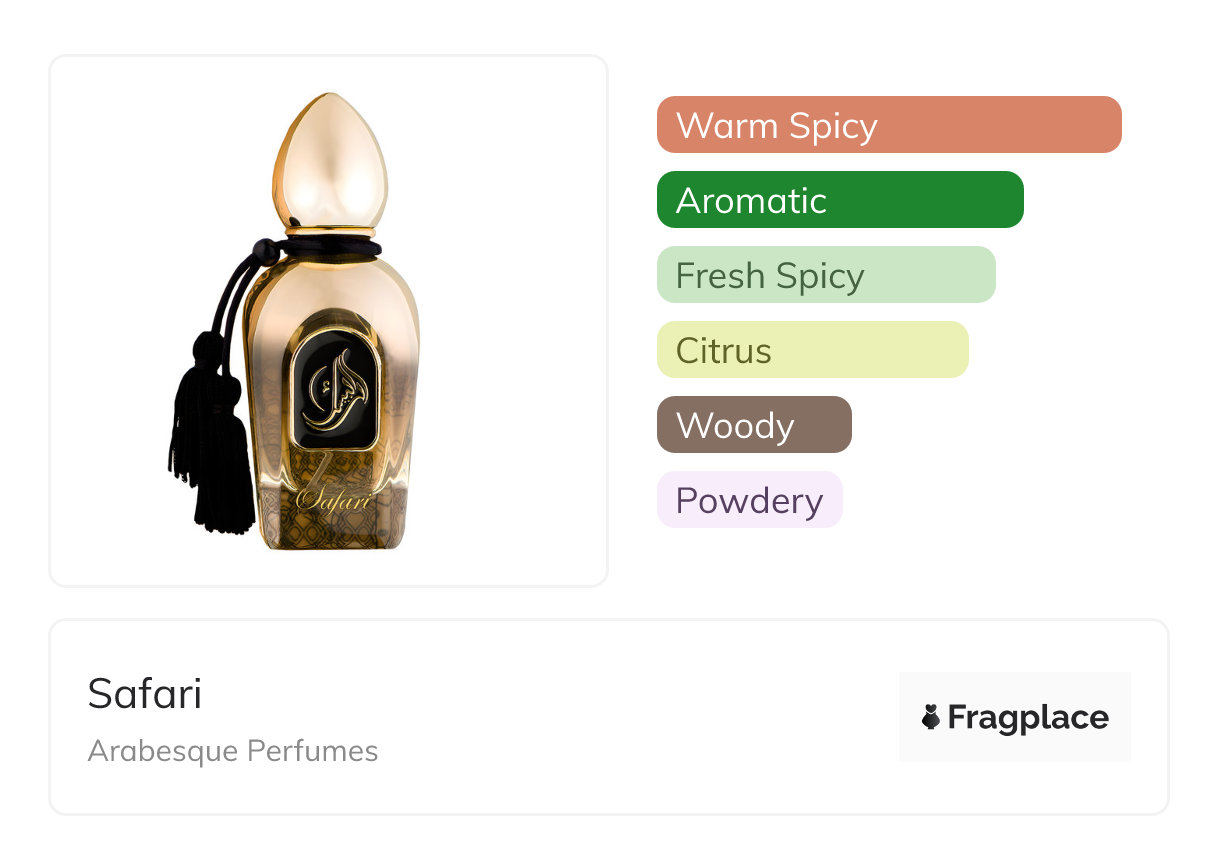 Safari, de Arabesque Perfumes fue lanzado en 2017. El perfumista detrás de esta creación es Jacques Huclier. Tiene las notas de salida de Bergamota, Lavanda, and Limón, notas de corazón de Manzana, Canela, Geranio, Notas picantes, and Whisky, and notas de fondo de Almizcle, Pachulí, and Vainilla.