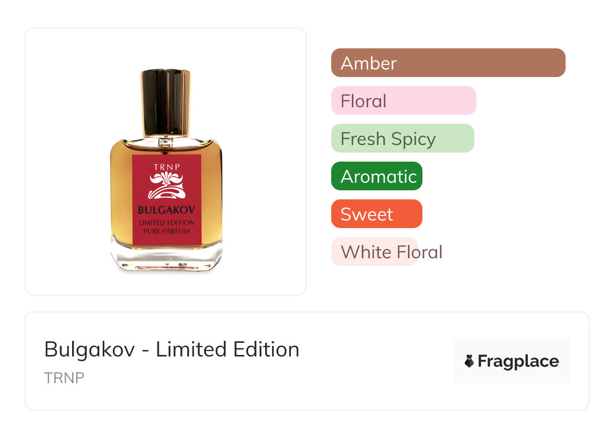 Bulgakov - Limited Edition, from TRNP was released in 2021. The perfumer behind this creation is unknown. It has the top notes of Caraway, Lavender, and Star Anise, middle notes of Jasmine and Rose, and base notes of Agarwood (Oud), Amber, Honey, Labdanum, Styrax, and Vanilla.