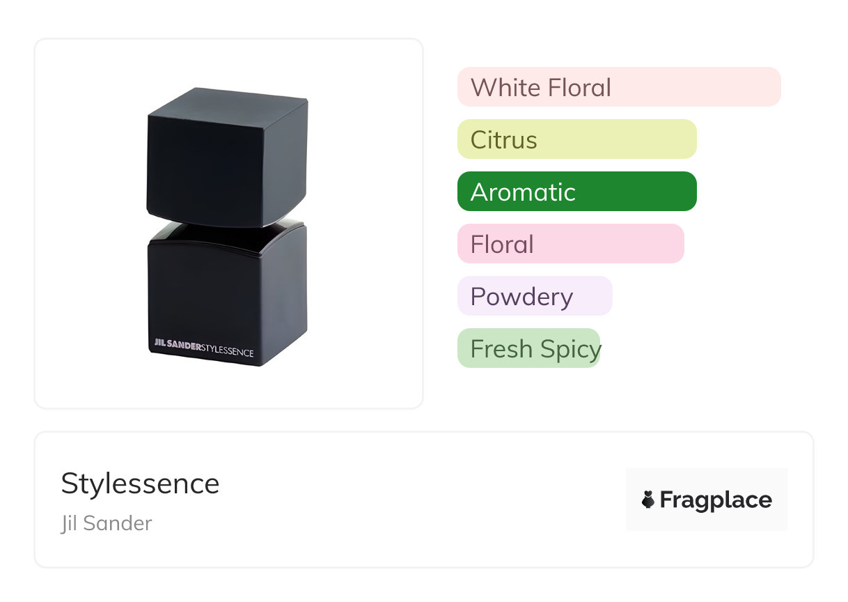 Stylessence, de Jil Sander fue lanzado en 2007. El perfumista detrás de esta creación es Bernard Ellena. Tiene las notas de salida de Cardamomo, Fresia, and Petitgrain, notas de corazón de Jazmín, Neroli, Azahar, and Violeta, and notas de fondo de Ámbar, Madera de hinoki, and Almizcle.