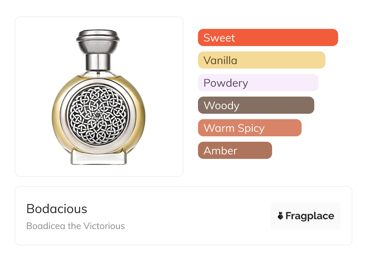 Bodacious, de Boadicea the Victorious fue lanzado en 2021. El perfumista detrás de esta creación es Christian Provenzano. Tiene las notas de salida de Almendra, Cereza, Clavo, and Coñac, notas de corazón de Heliotropo, Jazmín, and Rosa, and notas de fondo de Ámbar, Almizcle, Sándalo, Tabaco, Haba Tonka, Vainilla, and Vetiver.