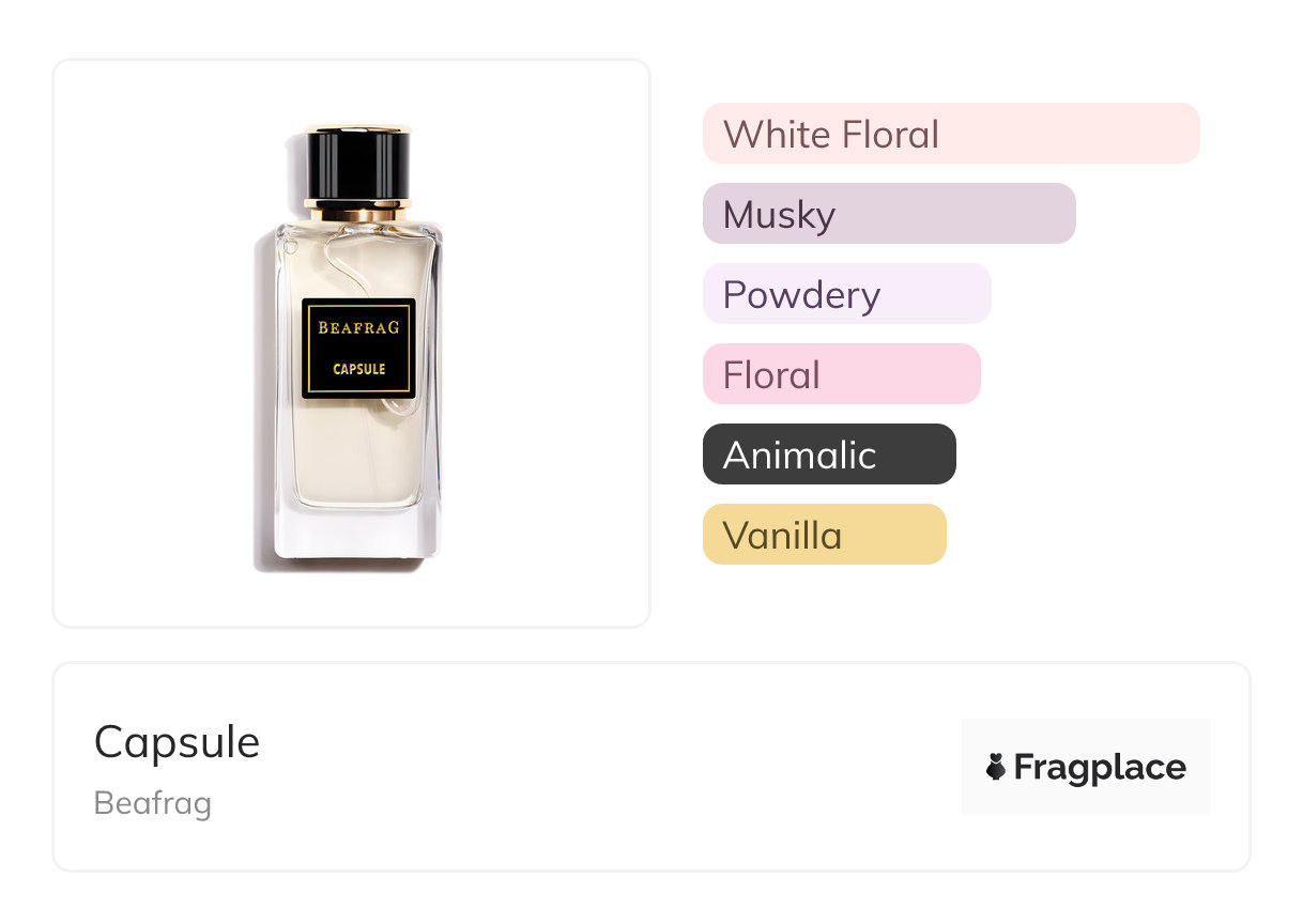 Capsule, de Beafrag fue lanzado en 2023. El perfumista detrás de esta creación es Marc Daniel Heimgartner. Las notas son Ámbar, Notas sobre animales, Notas balsámicas, Notas florales, Jazmín, Lily, Almizcle, Notas picantes, Vainilla, Notas de madera.