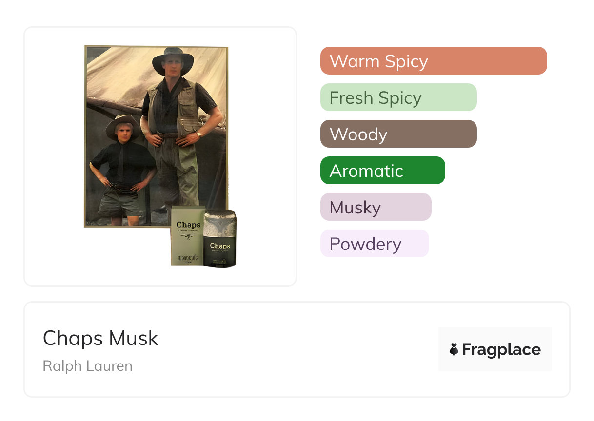 Chaps Musk, de Ralph Lauren fue lanzado en 1985. El perfumista detrás de esta creación es desconocido. Tiene las notas de salida de Anís, Cítricos, and Lavanda, notas de corazón de Geranio, Miel, and Notas picantes, and notas de fondo de Ámbar, Almizcle, Pachulí, and Sándalo.
