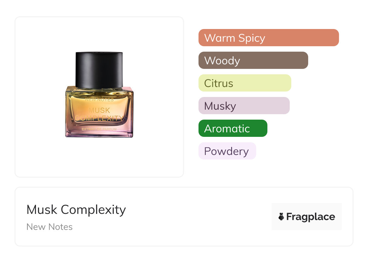 Musk Complexity, de New Notes fue lanzado en 2022. El perfumista detrás de esta creación es desconocido. Tiene las notas de salida de Bergamota, Jengibre, Limón, Petitgrain, Frutos rojos, and Ron, notas de corazón de Cardamomo, Flor de chocolate, Jazmín, and Labdanum, and notas de fondo de Notas sobre animales, Azúcar moreno, Canela, Civet, Madera de Guayacán, Almizcle, Pachulí, and Sándalo.