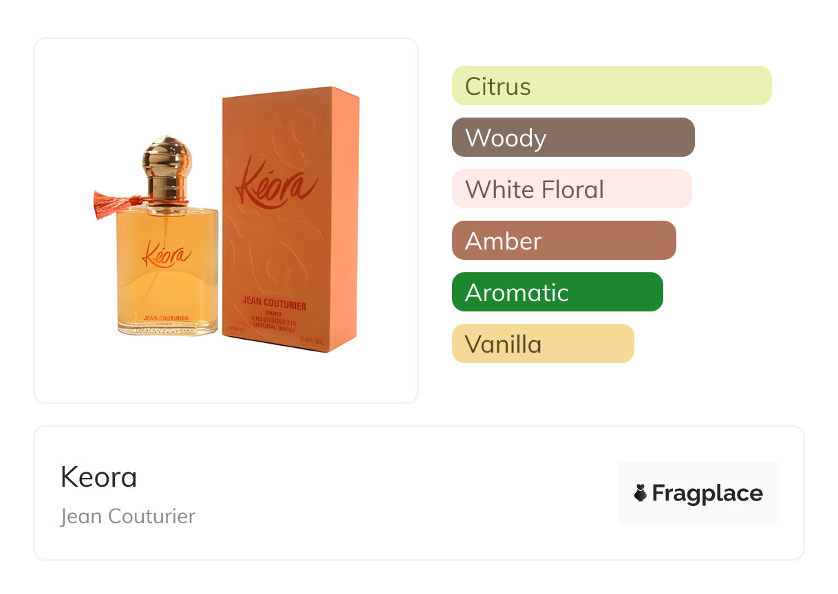 Keora, from Jean Couturier was released in 1983. The perfumer behind this creation is Jacqueline Couturier. It has the top notes of Bergamot, Lemon, Mandarin Orange, Neroli, and Palisander Rosewood, middle notes of Iris, Jasmine, Lily-of-the-Valley, and Rose, and base notes of Ambergris, Benzoin, Civet, Leather, Patchouli, Tonka Bean, Vanilla, and Vetiver.