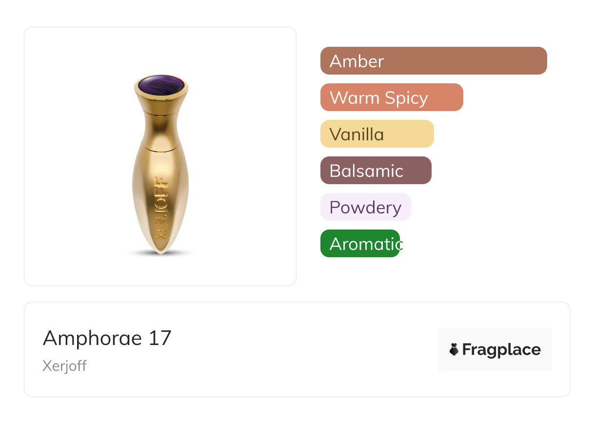 Amphorae 17, de Xerjoff fue lanzado en 2022. El perfumista detrás de esta creación es desconocido. Tiene las notas de salida de Ámbar, Davana, and Hoja violeta, notas de corazón de Benjuí, Incienso, and Mirra, and notas de fondo de Almizcle, Sándalo, Haba Tonka, and Vainilla.