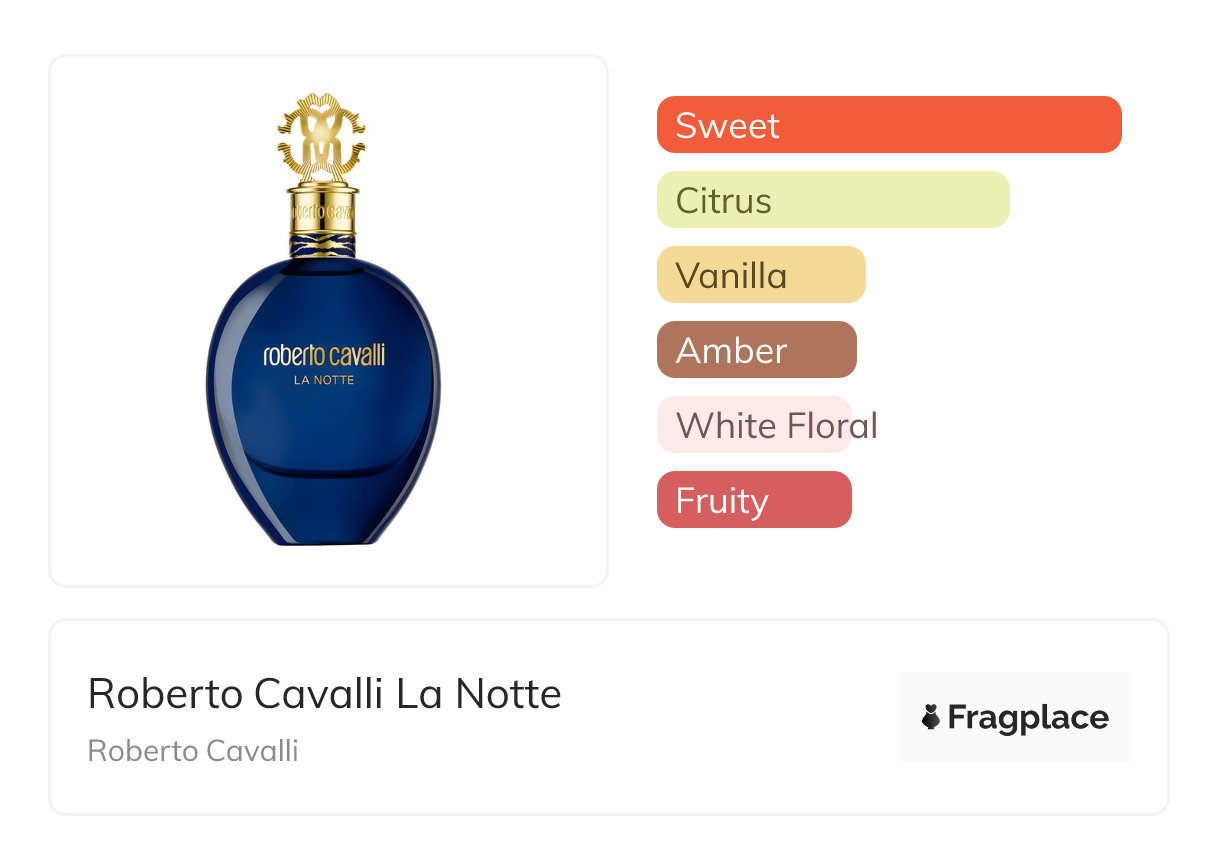 Roberto Cavalli La Notte, de Roberto Cavalli fue lanzado en 2018. El perfumista detrás de esta creación es Louise Turner. Tiene las notas de salida de Naranja mandarina and Pimienta rosa, notas de corazón de Licor, Azahar, and Frambuesa, and notas de fondo de Ámbar, Pachulí, and Vainilla.