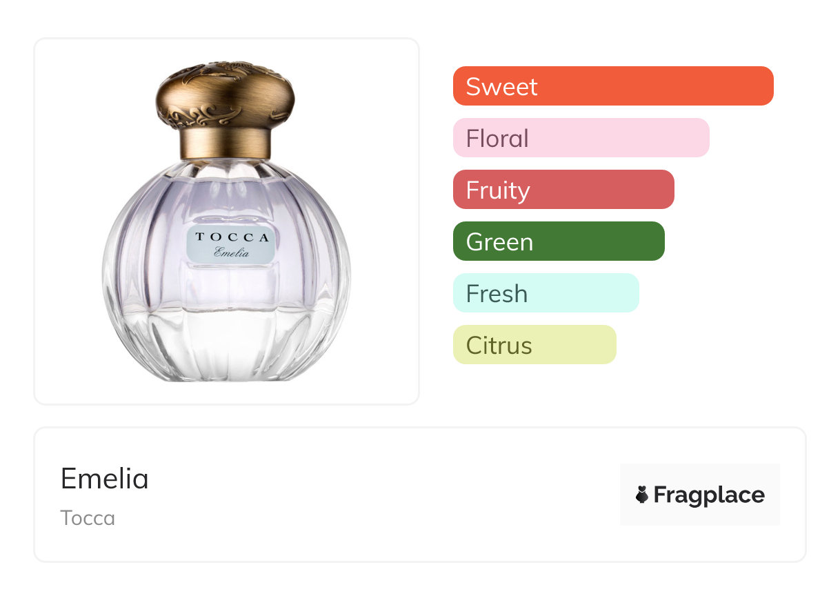 Emelia, de Tocca fue lanzado en 2016. El perfumista detrás de esta creación es desconocido. Tiene las notas de salida de Buchu o Agathosma, Clementina, Hoja de higuera, Níspero japonés, and Magnolia, notas de corazón de Amarillys, Figura, Hierba, Iris, and Mate, and notas de fondo de Ambrette (Malva almizclera), Coco, and Praliné.