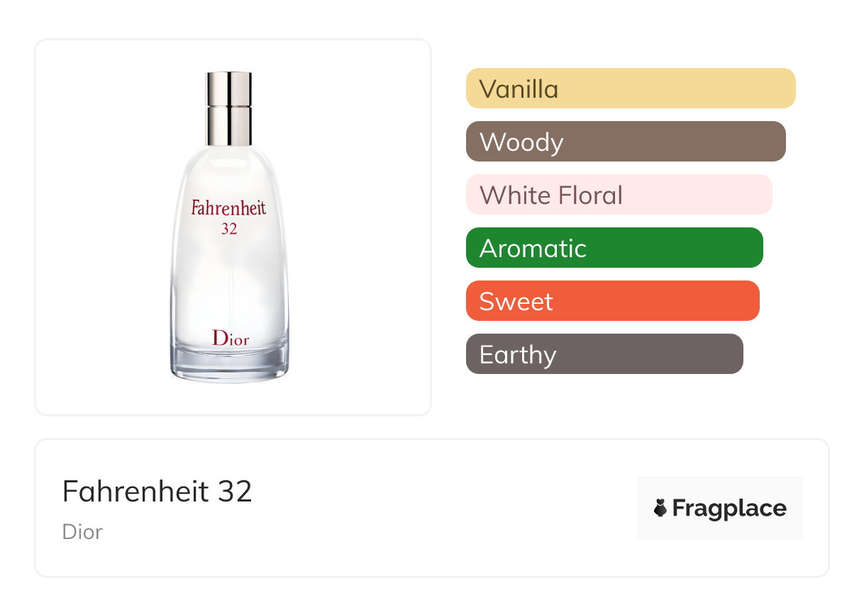En retrospectiva, en mi reseña a continuación, fui demasiado suave con esta fragancia la primera vez. Esta es la tercera vez que la uso y ya me he formado una opinión: Fahrenheit 32 no es para nada de mi gusto. Todavía percibo un pequeño toque de violeta empolvada (¿me estoy volviendo loco/voluntario al pensar que es un flanker de Fahrenheit?) en el fondo, pero 32 es principalmente una fragancia barata de vainilla y flores blancas. No es esa combinación de notas en particular, porque a veces huele bien, sino más bien la mala calidad que la defrauda. La manzana ha caído lejos del árbol.