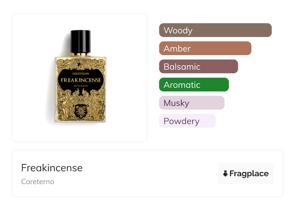 Freakincense, de Coreterno fue lanzado en 2023. El perfumista detrás de esta creación es Luca Maffei. Tiene las notas de salida de Cal, Pimienta rosa, and Violeta, notas de corazón de Cashmeran, Elemi, and Incienso, and notas de fondo de Labdanum, Pachulí, and Vetiver.