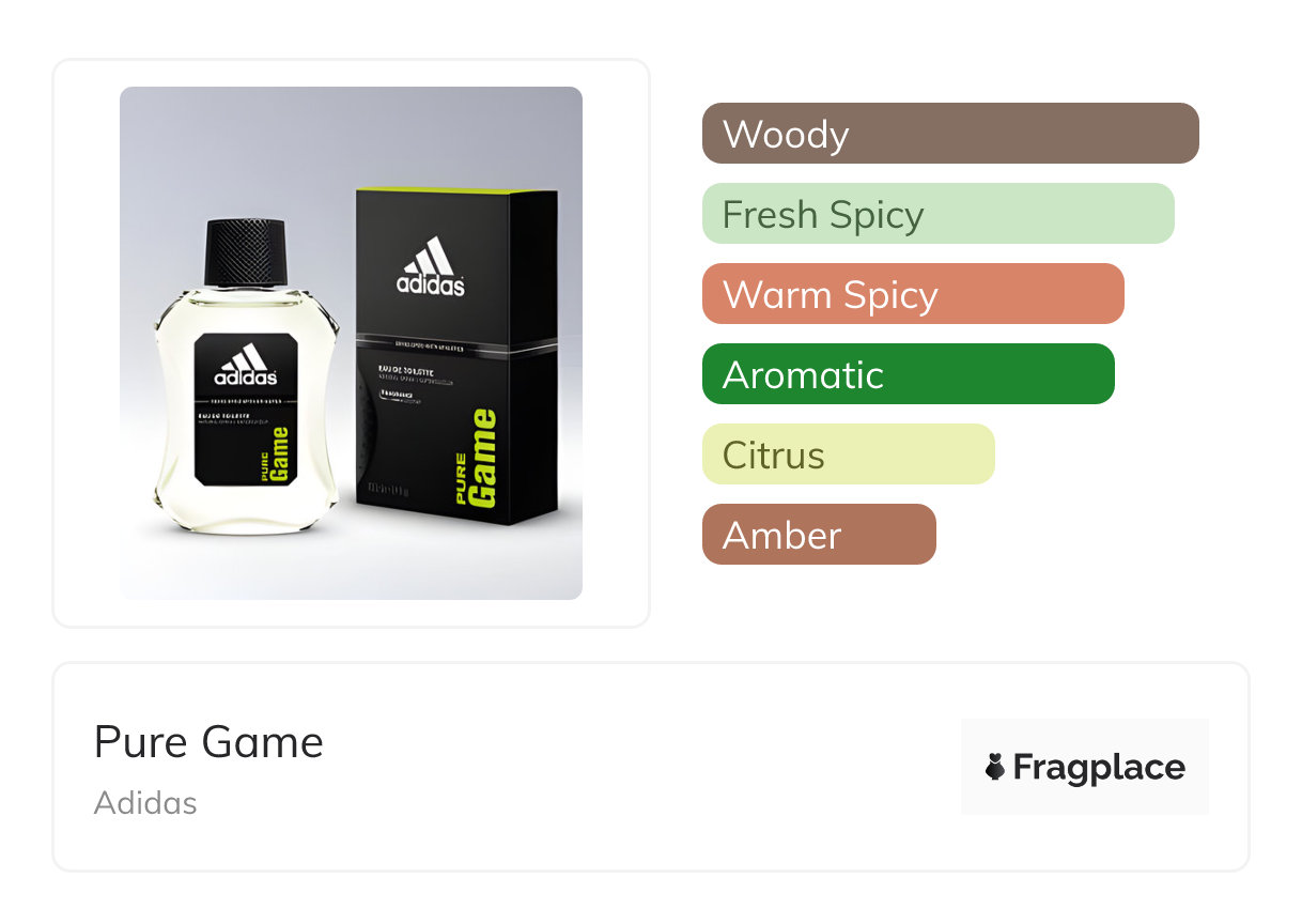 Pure Game, de Adidas fue lanzado en 2010. El perfumista detrás de esta creación es desconocido. Tiene las notas de salida de Albahaca, Pomelo, Naranja mandarina, and Pimienta, notas de corazón de Ciprés, Madera de Guayacán, and Lavanda, and notas de fondo de Incienso, Pachulí, Sándalo, and Haba Tonka.