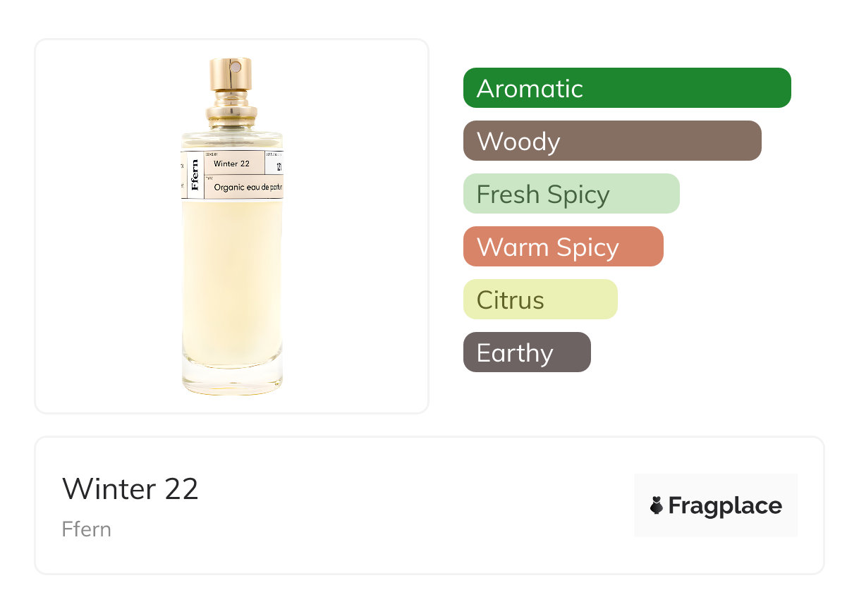Winter 22, de Ffern fue lanzado en 2021. El perfumista detrás de esta creación es Elodie Durande. Tiene las notas de salida de Cáscara de limón, Menta, Naranja, and Estragón, notas de corazón de Bergamota, Cardamomo, Clavo, Jazmín, Mejorana, Mimosa, and Pachulí, and notas de fondo de Algas, Madera de cedro, Abeto, Lavanda, Oakmoss, Sándalo, and Vetiver.