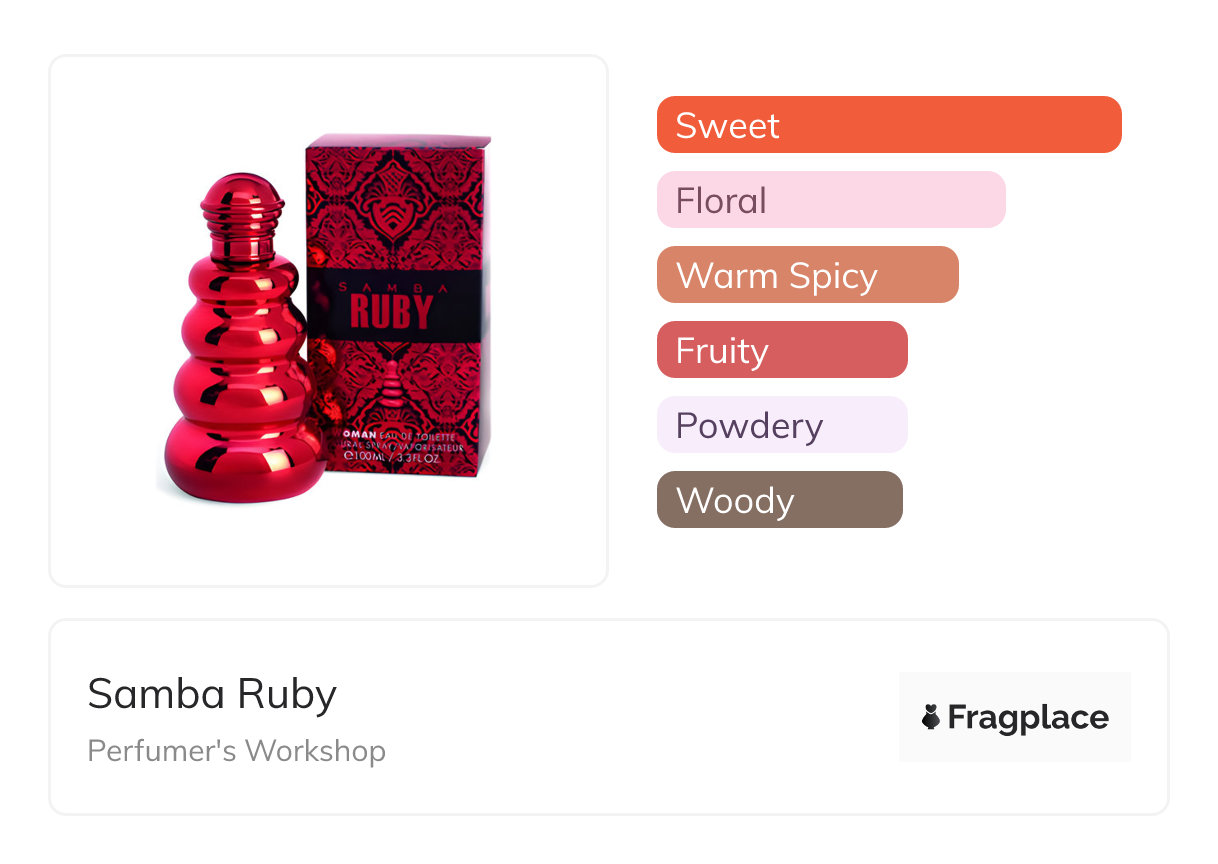 Samba Ruby, de Perfumer's Workshop fue lanzado en 2016. El perfumista detrás de esta creación es Gil Clavien. Tiene las notas de salida de Regaliz, Nectarina, and Fresa, notas de corazón de Dalia, Rosa, and Anís estrellado, and notas de fondo de Benjuí, Orquídea, Pachulí, Sándalo, and Haba Tonka.