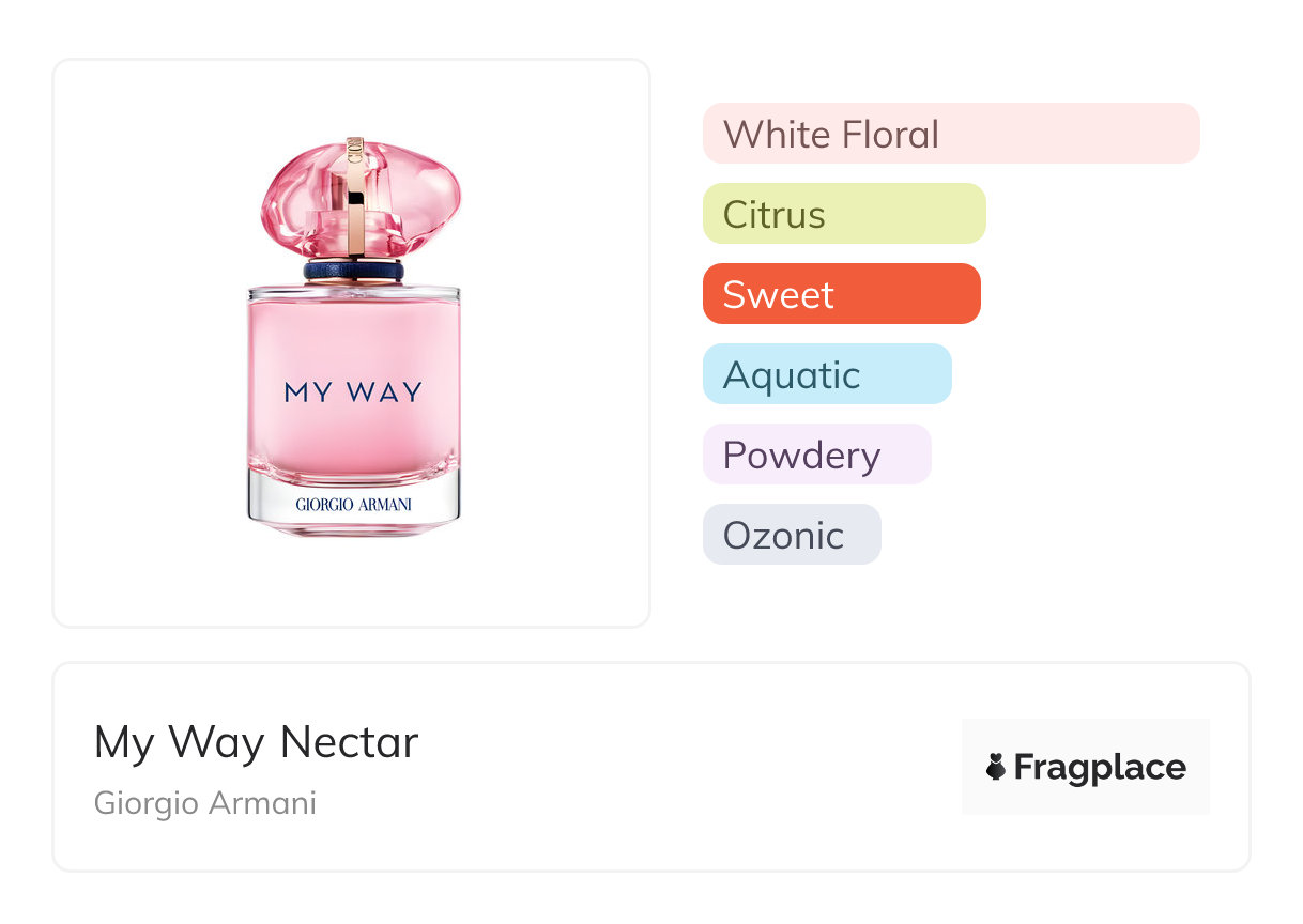 My Way Nectar, de Giorgio Armani fue lanzado en 2024. El perfumista detrás de esta creación es desconocido. Tiene las notas de salida de Bergamota, Azahar, and Pera, notas de corazón de Jazmín, Tuberosa, and Hoja violeta, and notas de fondo de Madera de cedro, Almizcle, and Vainilla.
