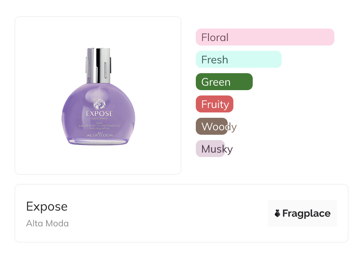 Expose, de Alta Moda fue lanzado en año desconocido. El perfumista detrás de esta creación es desconocido. Tiene las notas de salida de Lila and Petitgrain, notas de corazón de Osmanthus, Flor de melocotón, Peonía, Té, and Glicinia, and notas de fondo de Ámbar, Madera de cedro, and Almizcle.