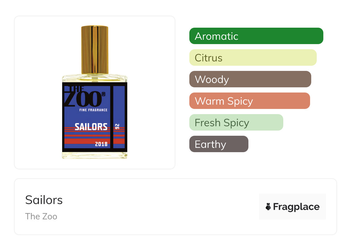 Sailors, de The Zoo a été lancé en 2018. Le parfumeur derrière cette création est Christophe Laudamiel. Il a les notes de tête de Artemisia, Bergamote, Bouleau, Orange amère, Caraway, Coriandre, Pamplemousse, Citron, Orange Mandarine, Néroli, and Feuille de violette, notes de cœur de Cardamome, Cannelle, Gingembre, Iris, Jasmin, Genévrier, Orris Root, and Poivre, and notes de fond de Ambre, Cashmeran, Bois de cèdre, Feuille de cannelle, Clous de girofle, Cuir, Mousse de chêne, Bois de santal, Algues, Thé, and Vétiver.