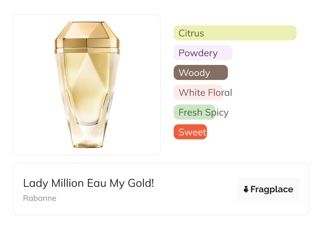 Lady Million Eau My Gold!, de Rabanne a été lancé en 2014. Le parfumeur derrière cette création est Anne Flipo. Il a les notes de tête de Bergamote, Pamplemousse, Orange Mandarine, Mangue, and Néroli, notes de cœur de Fleur d'oranger and Violet, and notes de fond de Ambre, Bois de cèdre, Musk, and Bois de santal.