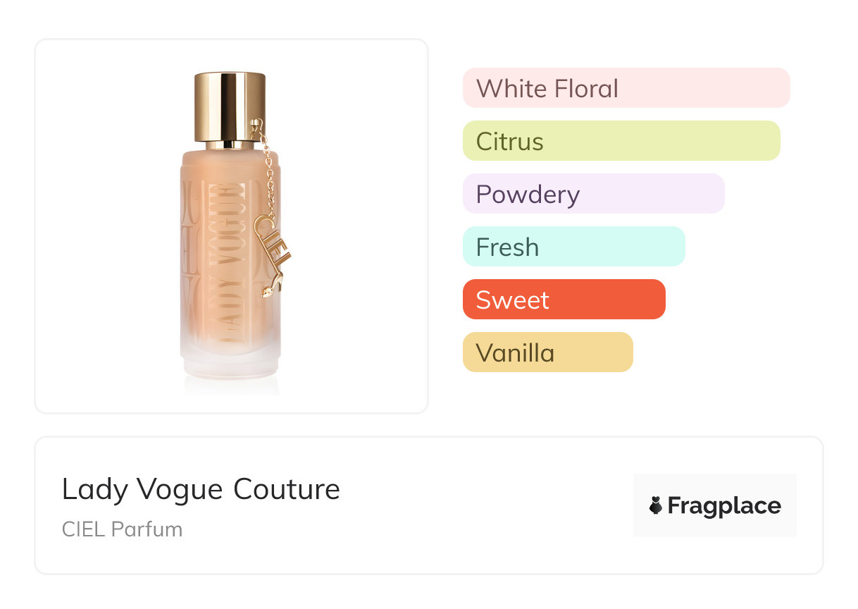 Lady Vogue Couture, de CIEL Parfum a été lancé en année inconnue. Le parfumeur derrière cette création est inconnu. Il a les notes de tête de Orange Mandarine and Nectarine, notes de cœur de Jasmin and Néroli, and notes de fond de Bois de santal and Vanille.