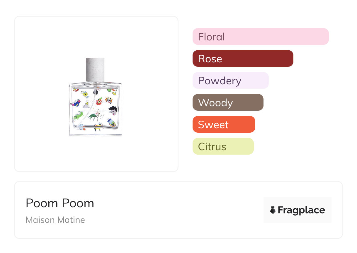 Poom Poom, de Maison Matine a été lancé en 2021. Le parfumeur derrière cette création est Remi Barbier. Il a les notes de tête de Kiwi, Mandarine fleur d'oranger, Orange, and Rose, notes de cœur de Freesia, Orchidée, Pivoine, and Rose, and notes de fond de L'arbre d'ébène, Musk, Bois de santal, and Vanille.