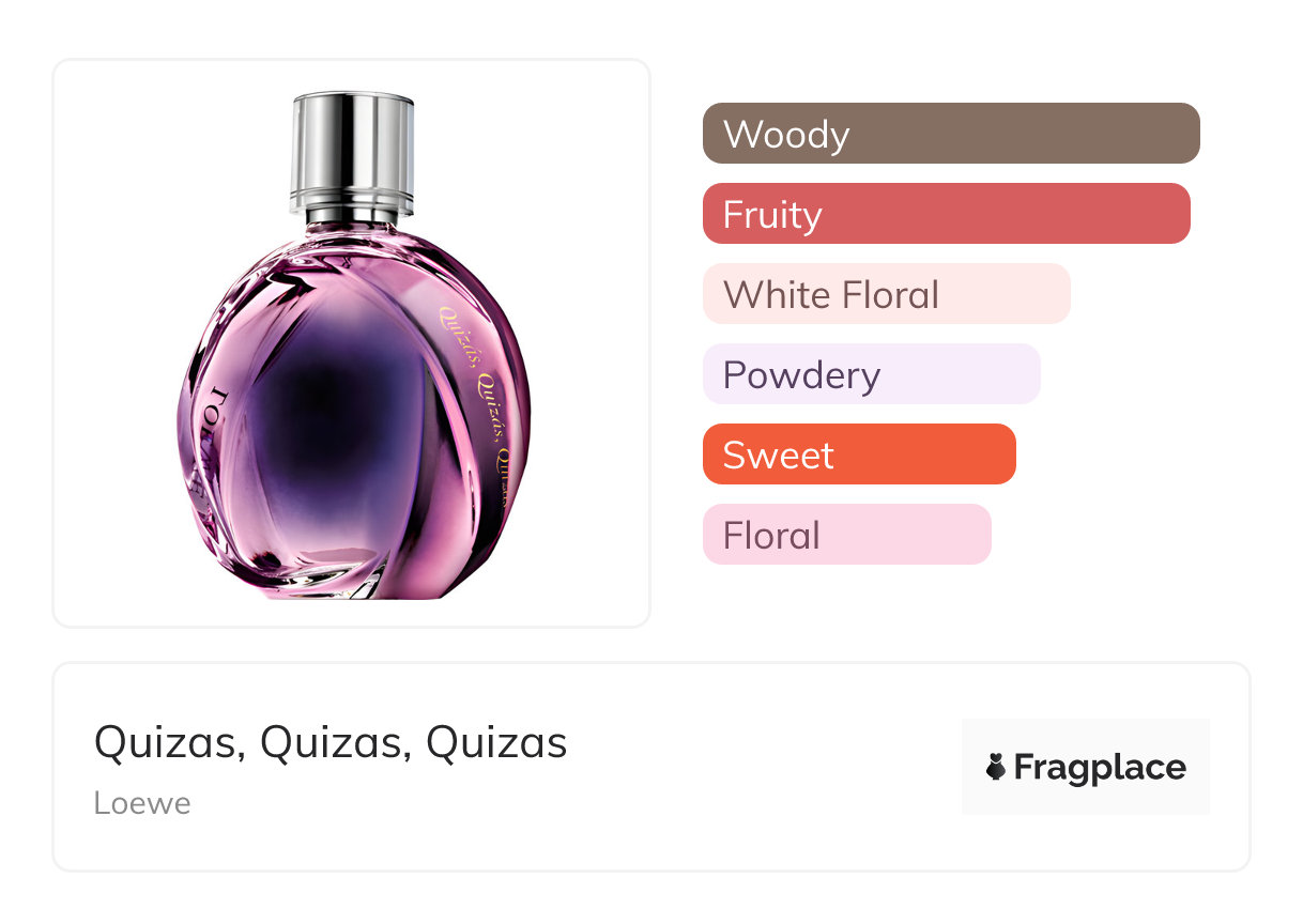 Quizas, Quizas, Quizas, de Loewe a été lancé en 2007. Le parfumeur derrière cette création est Carlos Benaim and Emilio Valeros. Il a les notes de tête de Cassis, Feuille et bourgeon de groseille, Citron, and Baies rouges, notes de cœur de Jasmin, Rose, and Tubéreuse, and notes de fond de Ambre, Miel, Musk, Patchouli, Bois de santal, and Vanille.