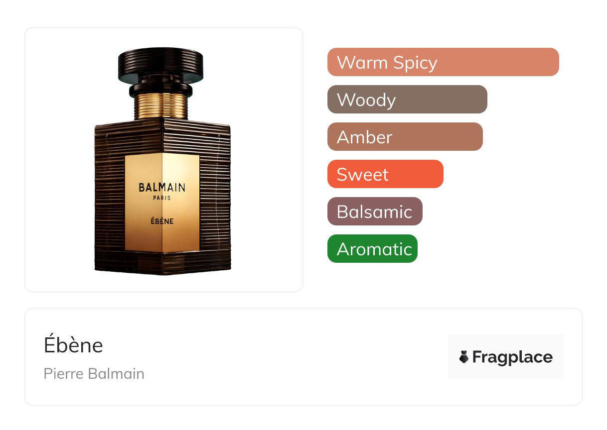 Ébène, de Pierre Balmain a été lancé en 2024. Le parfumeur derrière cette création est inconnu. Les notes sont Bois de cèdre, Cannelle, L'arbre d'ébène, Géranium, Encens, Myrrhe, Tabac, Vanille.