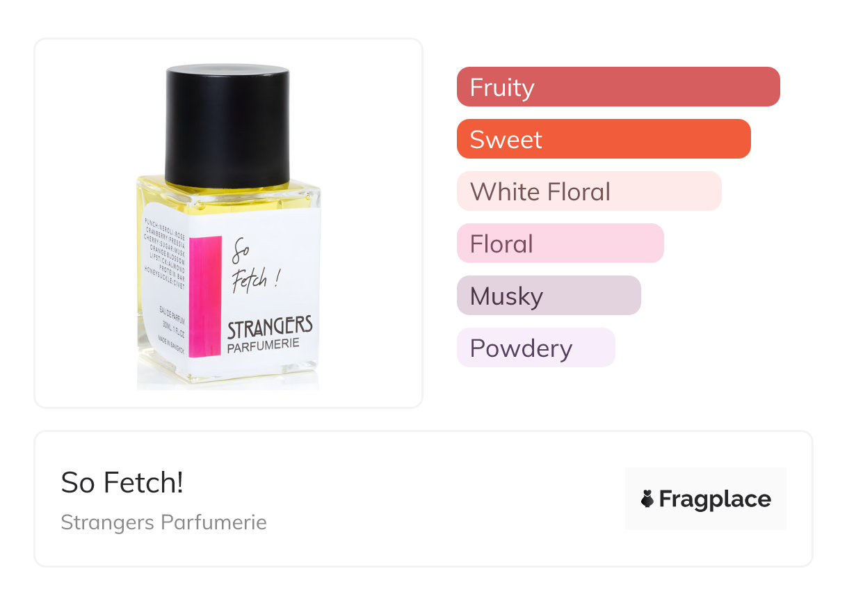 So Fetch!, de Strangers Parfumerie a été lancé en 2019. Le parfumeur derrière cette création est Prin Lomros. Les notes sont Amande, Cerise, Civette, Canneberge, Chocolat noir, Freesia, Chèvrefeuille, Rouge à lèvres, Musk, Néroli, Fleur d'oranger, Guignol, Rose, Sucre.