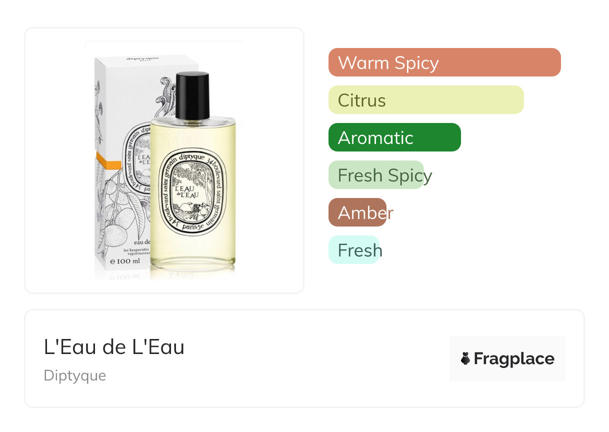 L'Eau de L'Eau, de Diptyque a été lancé en 2008. Le parfumeur derrière cette création est Olivier Pescheux. Il a les notes de tête de Pamplemousse, Citron, Orange Mandarine, and Petitgrain, notes de cœur de Cannelle, Clous de girofle, Géranium, Gingembre, Lavande, Fleur d'oranger, and Pimento, and notes de fond de Benjoin, Patchouli, and Fève de Tonka.