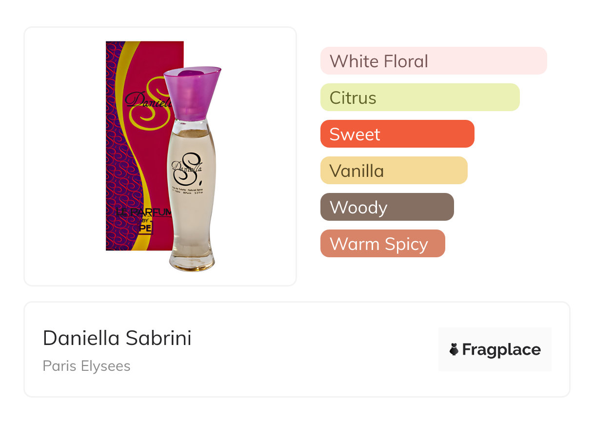 Daniella Sabrini, de Paris Elysees a été lancé en 2010. Le parfumeur derrière cette création est inconnu. Il a les notes de tête de Aldéhydes and Bergamote, notes de cœur de Jasmin, Muguet, Orange, and Fleur d'oranger, and notes de fond de Patchouli, Bois de santal, Fève de Tonka, and Vanille.