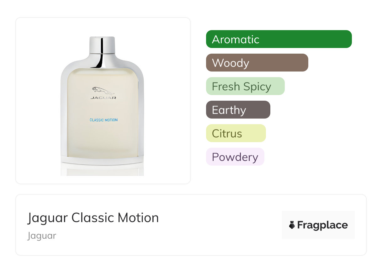 Jaguar Classic Motion, de Jaguar a été lancé en 2013. Le parfumeur derrière cette création est Karine Dubreuil-Sereni. Il a les notes de tête de Bergamote, Bouleau, Citron, and Menthe, notes de cœur de Coriandre, Lavande, Poivre, and Eau de mer, and notes de fond de Ambre, Musk, Orris Root, Patchouli, Bois de santal, and Vétiver.