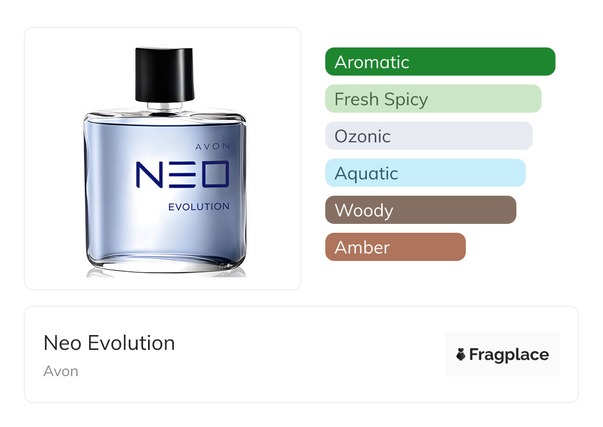 Neo Evolution, de Avon a été lancé en 2013. Le parfumeur derrière cette création est Richard Herpin. Il a les notes de tête de Poivre, Romarin, and Tamarin, notes de cœur de Jasmin, Lotus, and Feuille de violette, and notes de fond de Ambroxan, Mousse au lait, and Vétiver.