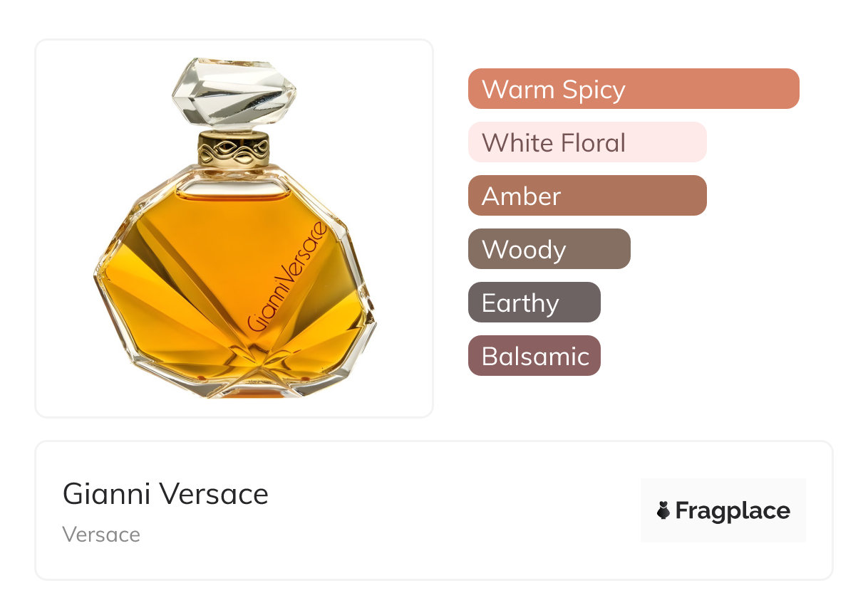 Gianni Versace, de Versace a été lancé en 1981. Le parfumeur derrière cette création est inconnu. Il a les notes de tête de Aldéhydes, Bergamote, Notes fruitées, and Notes épicées, notes de cœur de Œillet, Gardenia, Jasmin, Muguet, Narcisse, Orris Root, and Tubéreuse, and notes de fond de Ambre, Benjoin, Encens, Cuir, Myrrhe, Mousse de chêne, Patchouli, and Bois de santal.