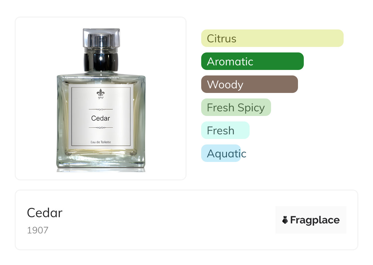 Cedar, de 1907 a été lancé en 2014. Le parfumeur derrière cette création est inconnu. Il a les notes de tête de Bergamote, Pamplemousse, Citron, Orange Mandarine, Menthe, Orange, and Thym, notes de cœur de Aldéhydes, Melon, and Eau de mer, and notes de fond de Ambre, Bois de cèdre, Mousse de chêne, Patchouli, and Bois de santal.