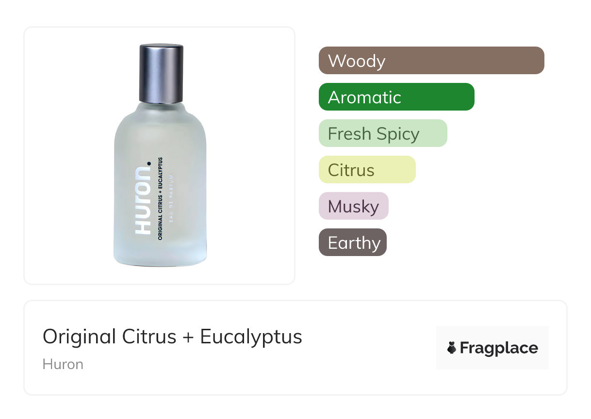 Original Citrus + Eucalyptus, de Huron a été lancé en 2022. Le parfumeur derrière cette création est inconnu. Il a les notes de tête de Citrus, Feuille de pamplemousse, Genévrier, and Menthe, notes de cœur de Eucalyptus, Géranium, Chaux, Mousse de chêne, Notes ozoniques, and Santolina, and notes de fond de Bois flotté, Musk, Patchouli, and Notes boisées.