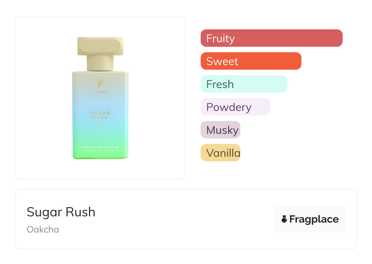 Sugar Rush, de Oakcha a été lancé en année inconnue. Le parfumeur derrière cette création est inconnu. Il a les notes de tête de Pomme, Cerise, and Myrtille, notes de cœur de Pivoine, Ananas, and Framboise, and notes de fond de Ambre, Musk, Bois de santal, and Vanille.