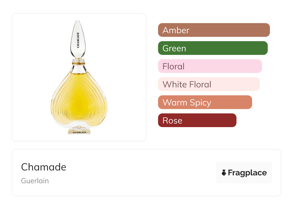Chamade, de Guerlain a été lancé en 1969. Le parfumeur derrière cette création est Jean-Paul Guerlain. Il a les notes de tête de Aldéhydes, Bergamote, Jacinthe, Jasmin, and Rose, notes de cœur de Clous de girofle, Galbanum, Jasmin, Lilas, Muguet, and Rose, and notes de fond de Ambre, Benjoin, Baume du Pérou, Bois de santal, Baume de Tolu, Vanille, and Vétiver.