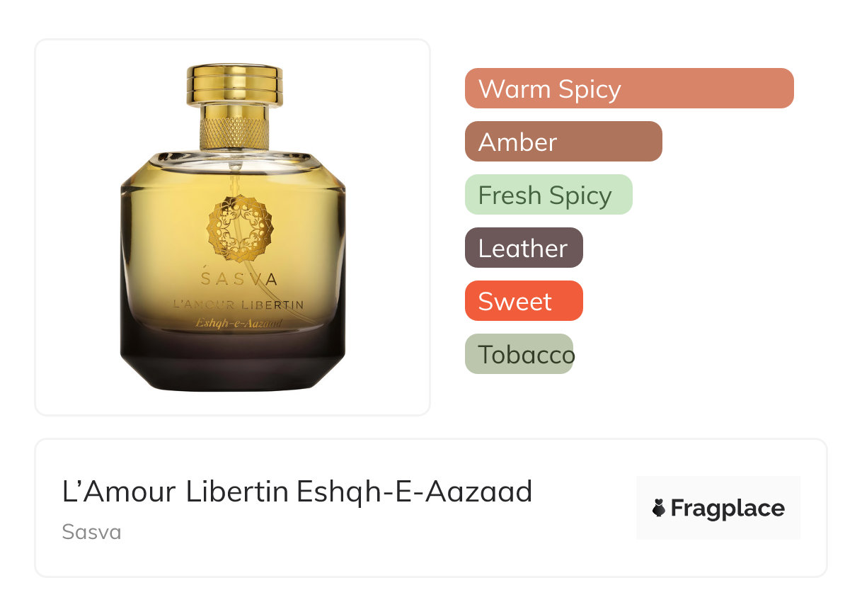 L’Amour Libertin Eshqh-E-Aazaad, de Sasva a été lancé en 2022. Le parfumeur derrière cette création est Gaël Montero. Il a les notes de tête de Gingembre, Lavande, Poivre, and Safran, notes de cœur de Ambre, Encens, Coquelicot, and Rhum, and notes de fond de Bois d'Agar (Oud), Benjoin, Cuir, Bois de santal, Tabac, and Vanille.